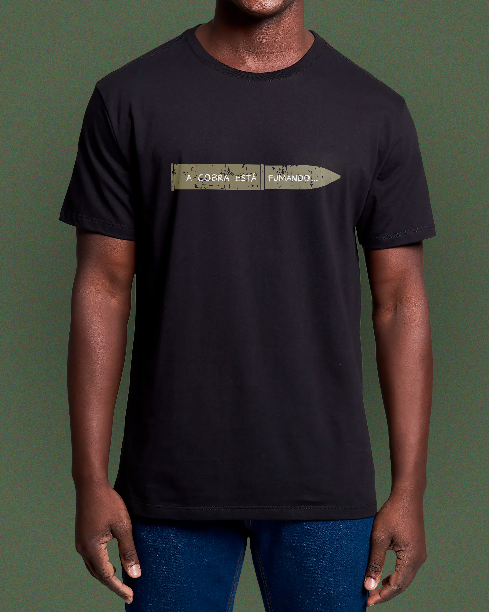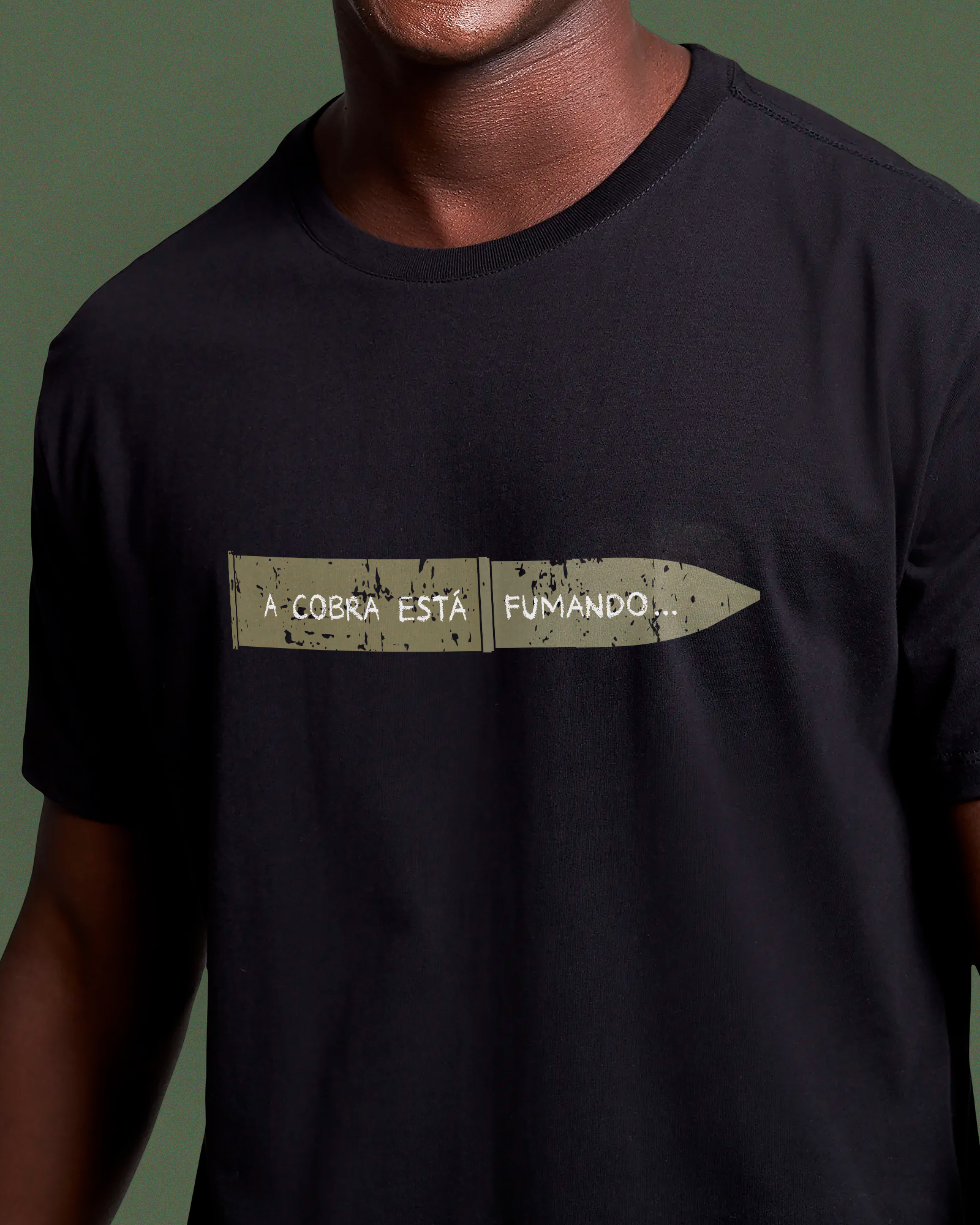 Estampa baseada na famosa foto do pracinha Francisco de Paula com um cartucho de artilharia onde se lê “A cobra está fumando”.