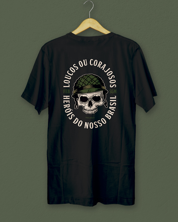 Demonstre seu respeito pelos heróis da Força Expedicionária Brasileira (FEB) com a peça exclusiva "Loucos ou Corajosos". Inspirada na bravura dos pracinhas brasileiros que lutaram na Segunda Guerra Mundial, essa estampa é um tributo aos soldados que, entre coragem e loucura, enfrentaram a dureza das batalhas para defender a liberdade.